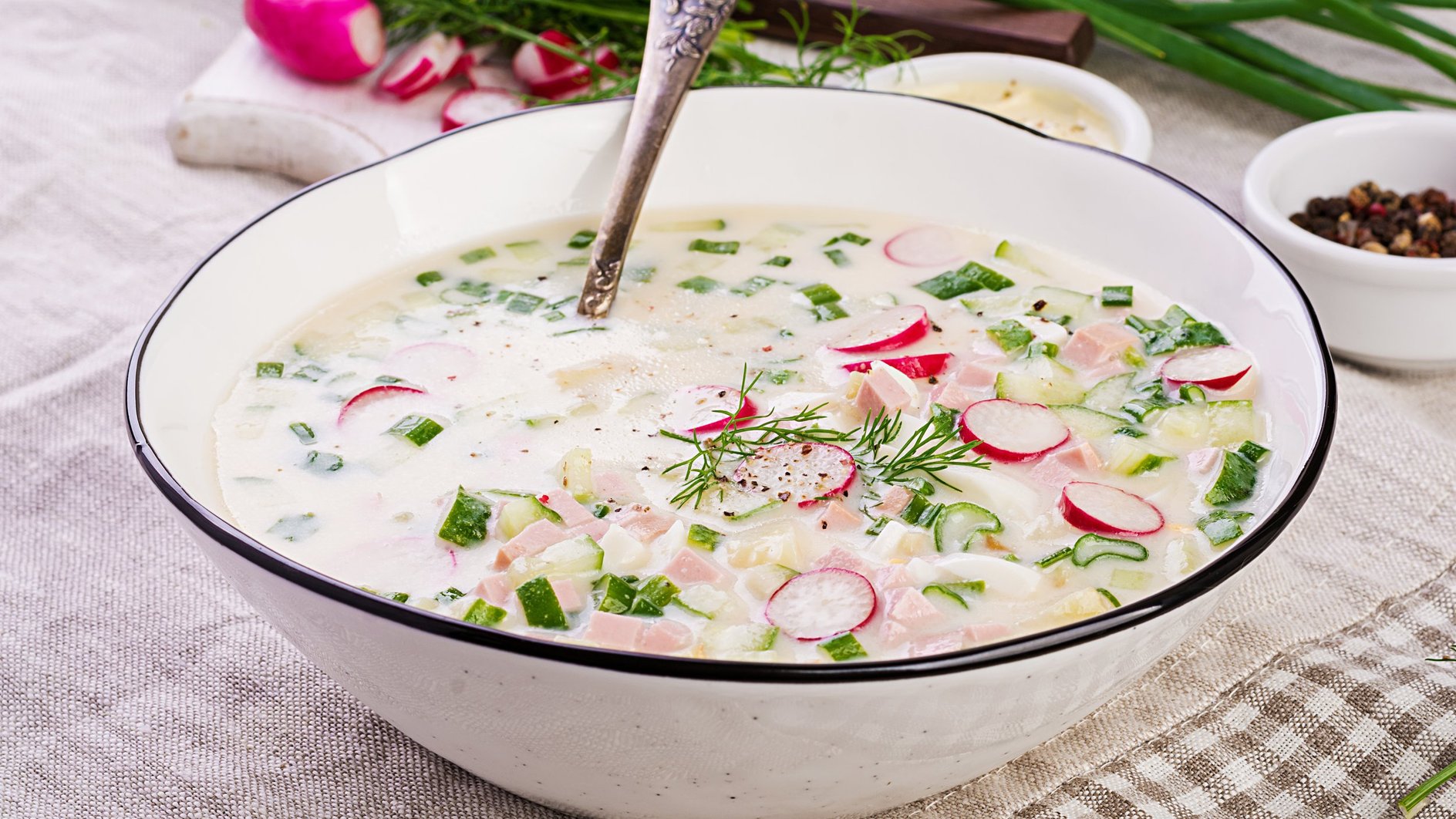 Традиционный вариант русского холодного супа — с квасом, колбасой и большим количеством зелени. В рецепте используются укроп, петрушка и зеленый лук, но вы можете добавить еще и сельдерей. Для любителей острых и пикантных вкусов рекомендуем подавать окрошку с горчицей и хреном.